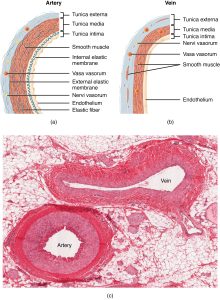 The walls of arteries and veins are largely composed of living cells and their products (including collagenous and elastic fibers); the cells require nourishment and produce waste. Since blood passes through the larger vessels relatively quickly, there is limited opportunity for blood in the lumen of the vessel to provide nourishment to or remove waste from the vessel’s cells. Further, the walls of the larger vessels are too thick for nutrients to diffuse through to all of the cells. Larger arteries and veins contain small blood vessels within their walls known as the vasa vasorum—literally “vessels of the vessel”—to provide them with this critical exchange. Since the pressure within arteries is relatively high, the vasa vasorum must function in the outer layers of the vessel (Figure 10.1.2) or the pressure exerted by the blood passing through the vessel would collapse it, preventing any exchange from occurring. The lower pressure within veins allows the vasa vasorum to be located closer to the lumen. The restriction of the vasa vasorum to the outer layers of arteries is thought to be one reason that arterial diseases are more common than venous diseases, since its location makes it more difficult to nourish the cells of the arteries and remove waste products. There are also minute nerves within the walls of both types of vessels that control the contraction and dilation of smooth muscle. These minute nerves are known as the nervi vasorum.
