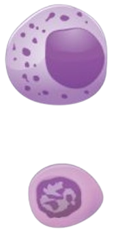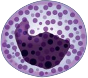 | Leukocytes (white blood cells) | Basophils | 44 (0-150) | Nucleus generally two-lobed but difficult to see due to presence of heavy, dense, dark purple granules | Promotes inflammation | Least common leukocyte lifespan unknown |