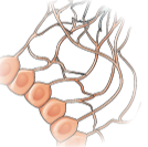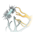 Also found in CNS tissue is the oligodendrocyte, sometimes called just “oligo,” which is the glial cell type that insulates axons in the CNS. The name means “cell of a few branches” (“oligo-” meaning “few”; “dendro-” meaning “branches”). There are a few processes that extend from the cell body. Each one reaches out and surrounds an axon to insulate it in myelin. One oligodendrocyte will provide the myelin for multiple axon segments, either for the same axon or for separate axons. The function of myelin will be discussed below.