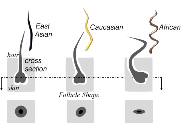 Figure 6.4.7. This comparative diagram illustrates how hair follicle shape differs among three major ethnic groups: East Asian, Caucasian, and African. The top row shows side-view cross-sections through the skin, depicting the hair shaft emerging from the follicle beneath the skin surface. The East Asian hair follicle is shown as nearly straight and perpendicular to the skin surface, producing straight hair. The Caucasian hair follicle has a slight curve, angled somewhat from perpendicular, producing wavy or slightly curved hair. The African hair follicle exhibits a pronounced curve or hook shape beneath the skin, angled sharply from perpendicular, which produces tightly coiled or kinky hair. The bottom row shows the corresponding cross-sectional shapes of the hair shafts themselves when cut straight across: East Asian hair appears nearly circular in cross-section, Caucasian hair is oval-shaped, and African hair is more flattened or elliptical. This structural difference in follicle shape and angle, along with the hair shaft cross-section, directly determines the natural texture and curl pattern of hair in different populations. The diagram uses simple grayscale illustrations with the skin surface clearly marked and dotted lines indicating the plane of the follicle cross-sections. [Return to Figure 6.4.7]
