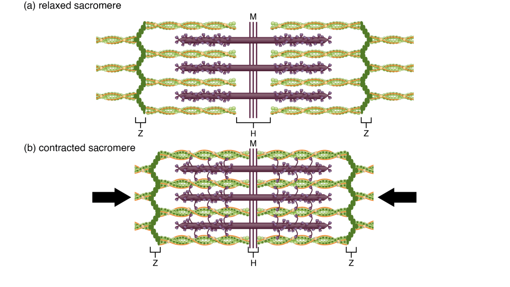 Because a sarcomere is defined by Z-discs, a single sarcomere contains one dark A-band with half of the lighter I-band on each end (Figure 8.2.2). During contraction the myofilaments themselves do not change length but actually slide across each other so the distance between the Z-discs shortens resulting in an overall shortening of the sarcomere. The length of the A-band does not change (the thick myosin filament remains a constant length), but the H-zone and I-band regions shrink. These regions represent areas where the filaments do not overlap, and as filament overlap increases during contraction, the length of these regions decrease.