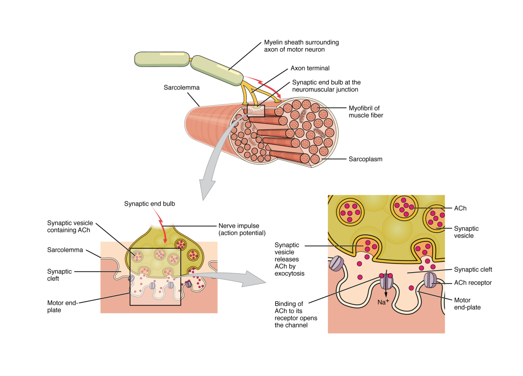 Signaling begins when a neuronal action potential travels along the axon of a motor neuron and then along the individual branches to terminate at the NMJ. At the NMJ, the axon terminal releases a chemical messenger, or neurotransmitter, called acetylcholine (ACh). The ACh molecules diffuse across a minute space called the synaptic cleft and bind to ACh receptors located within the motor end-plate of the sarcolemma on the other side of the synapse. Once ACh binds, a channel in the ACh receptor opens and positively charged ions can pass through into the muscle fiber, causing it to depolarize, meaning that the membrane potential of the muscle fiber becomes less negative (closer to zero).