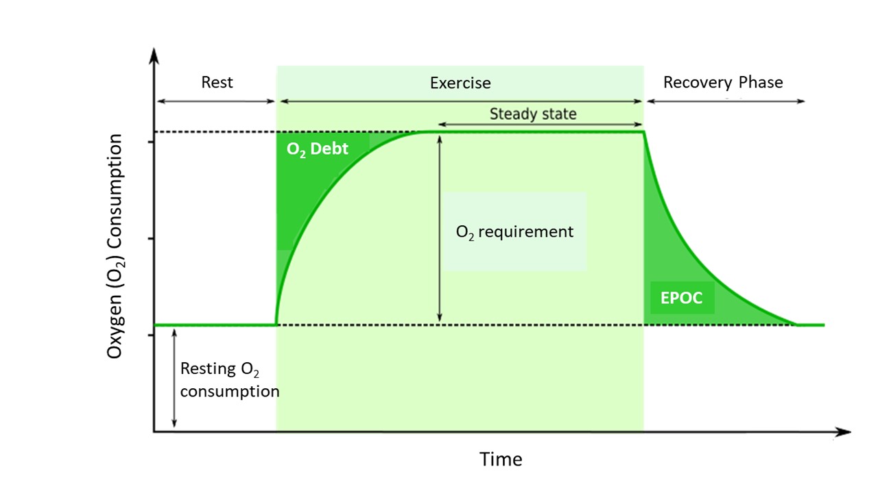 Intense muscle activity results in an oxygen debt, which is the amount of oxygen needed to compensate for ATP produced without oxygen during muscle contraction. Until the oxygen debt has been met, oxygen intake will remain elevated even after exercise has stopped; this is known as excess post-exercise oxygen consumption (EPOC).