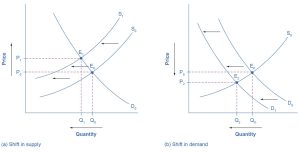 Consumer and business confidence often reflect macroeconomic realities; for example, confidence is usually high when the economy is growing briskly and low during a recession. However, economic confidence can sometimes rise or fall for reasons that do not have a close connection to the immediate economy, like a risk of war, election results, foreign policy events, or a pessimistic prediction about the future by a prominent public figure. U.S. presidents, for example, must be careful in their public pronouncements about the economy. If they offer economic pessimism, they risk provoking a decline in confidence that reduces consumption and investment and shifts AD to the left, and in a self-fulfilling prophecy, contributes to causing the recession that the president warned against in the first place. Figure 24.8 (b) shows a shift of AD to the left, and the corresponding movement of the equilibrium, from E0 to E1, to a lower quantity of output and a lower price level.